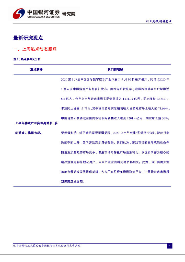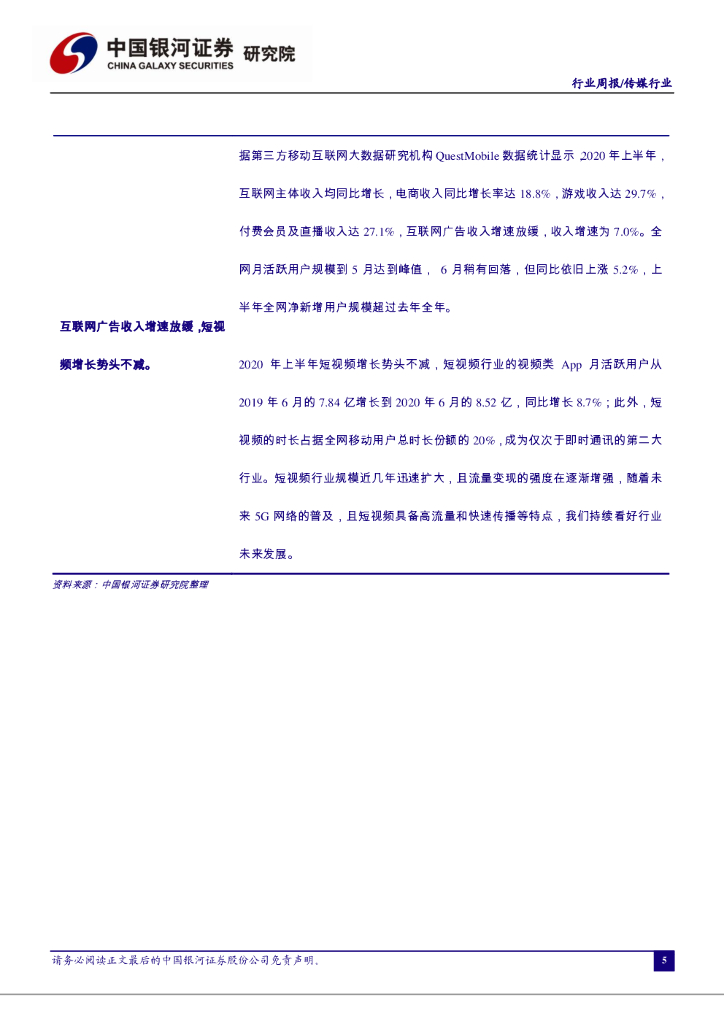 中国银河:传媒行业周报:上半年游戏产业实现高增长,短视频增长势头不减.pdf