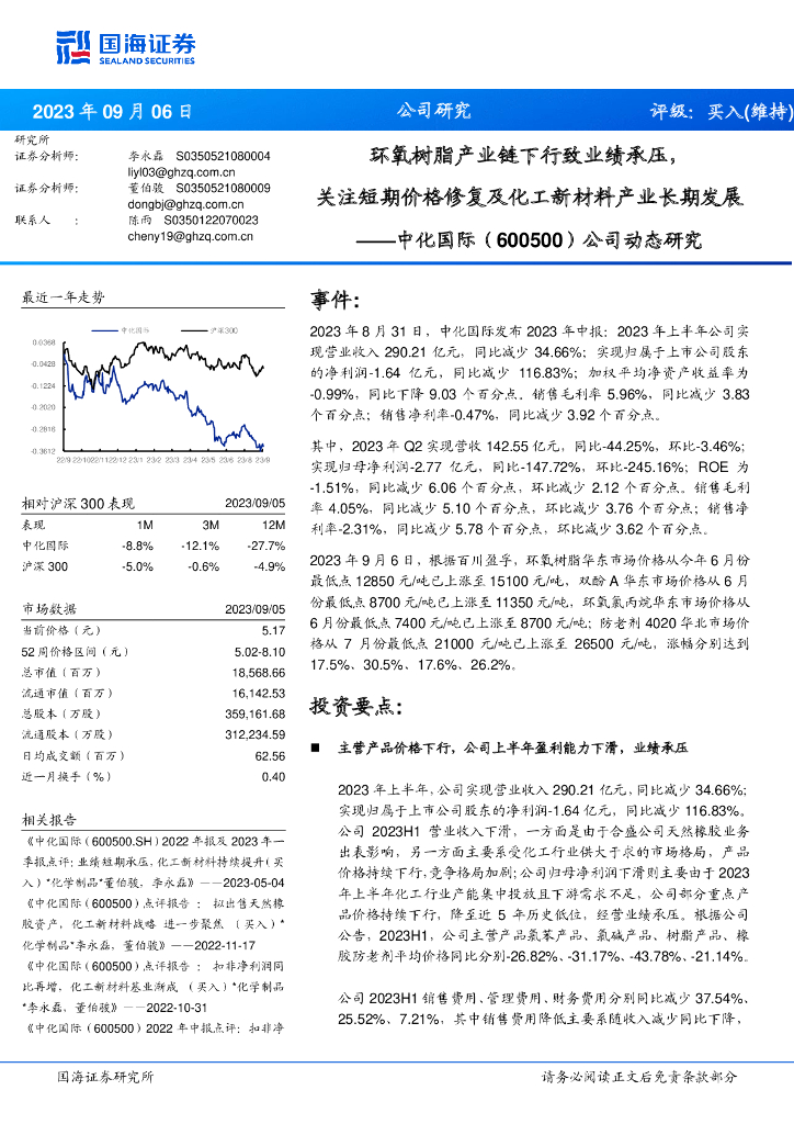 国海证券:中化国际(600500)-公司动态研究:环氧树脂产业链下行致业绩承压,关注短期价格修复及化工新材料产业长期发展.pdf