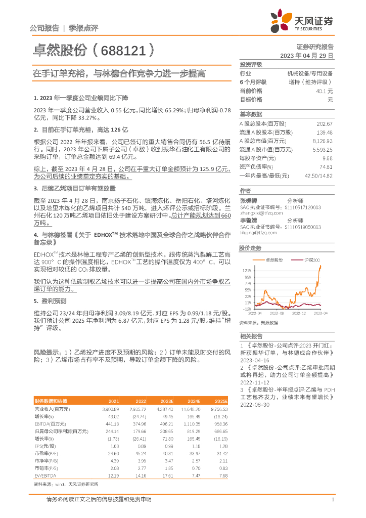 天风证券:卓然股份(688121)-在手订单充裕,与林德合作竞争力进一步提高.pdf