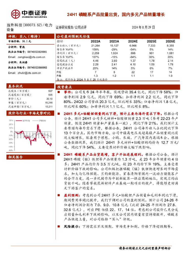 中泰证券:当升科技(300073)-24H1磷酸系产品批量出货,国内多元产品销量增长.pdf