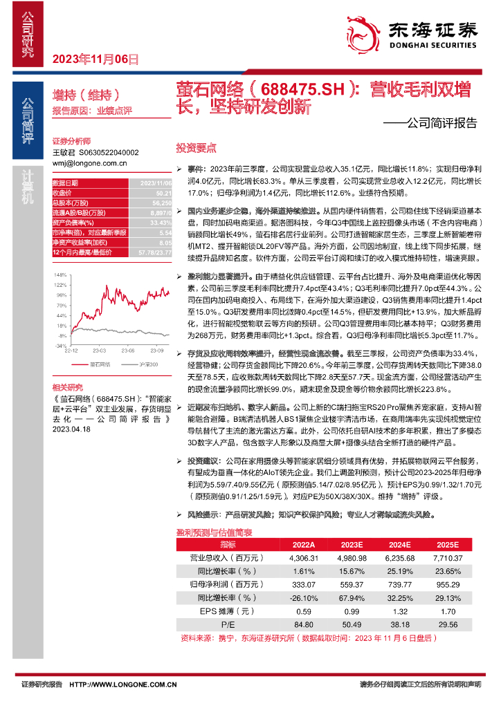 东海证券:萤石网络(688475)-公司简评报告:营收毛利双增长,坚持研发创新.pdf