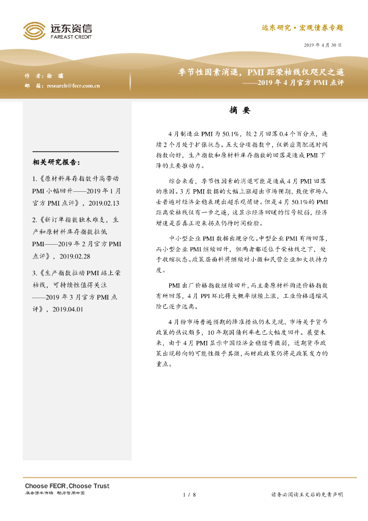 远东资信:季节性因素消退,PMI距荣枯线仅咫尺之遥——2019年4月官方PMI点评.pdf