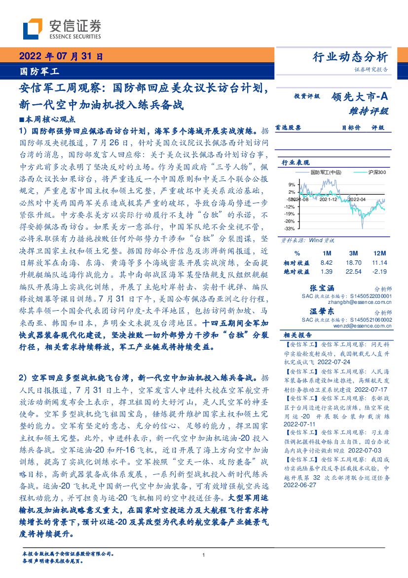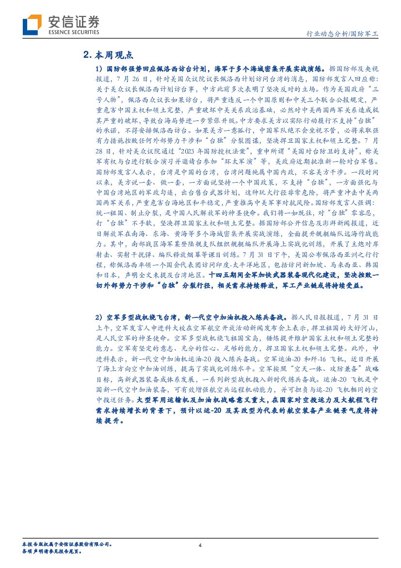 安信证券:安信军工周观察:国防部回应美众议长访台计划,新一代空中加油机投入练兵备战.pdf
