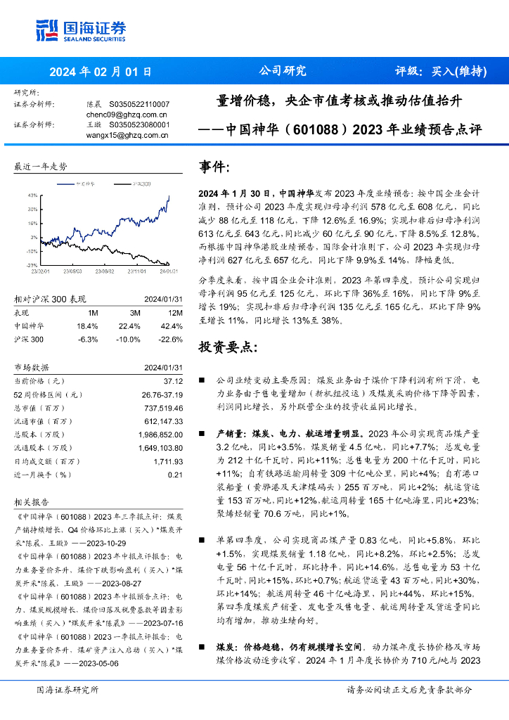 国海证券:中国神华(601088)-2023年业绩预告点评:量增价稳,央企市值考核或推动估值抬升.pdf