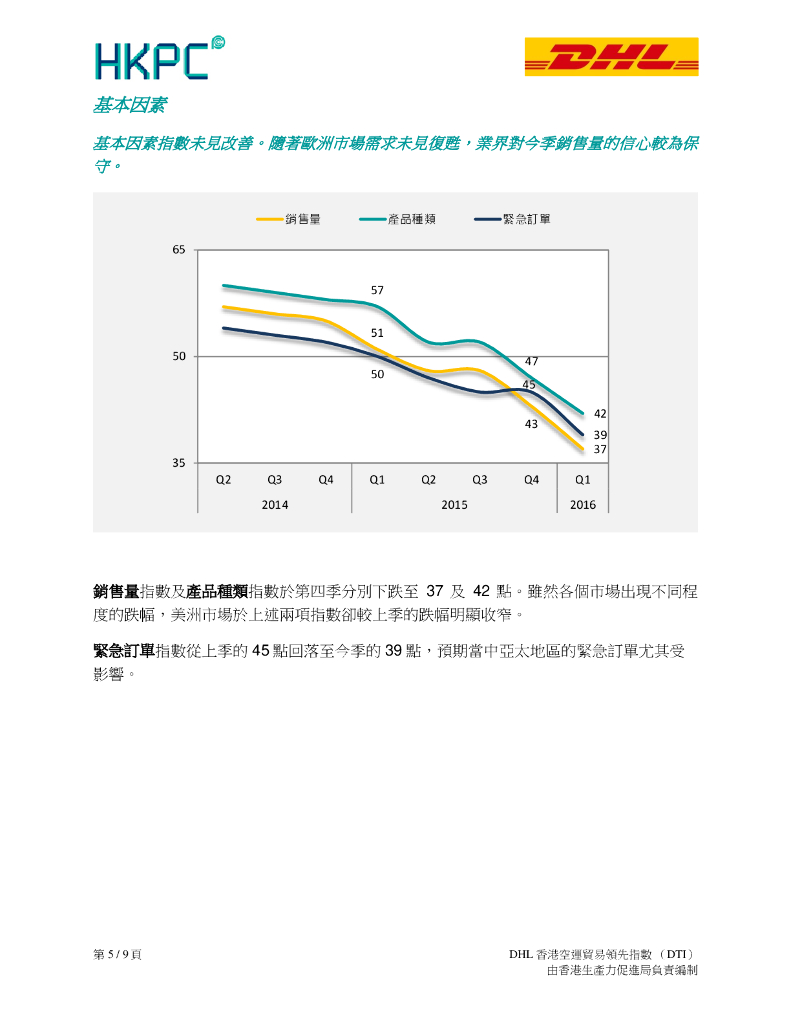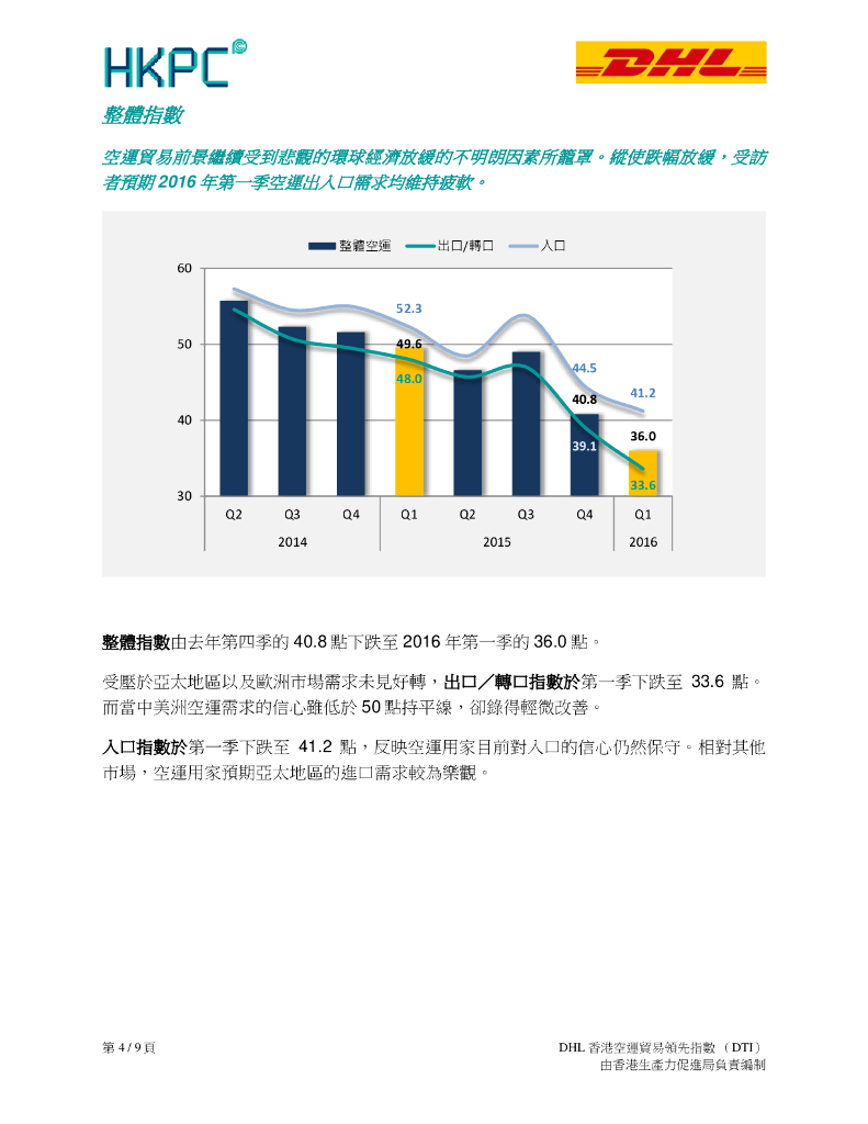 香港生产力促进局:2016年第一季度DHL香港空运贸易领先指数(DTI)报告(繁体版).pdf