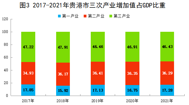 初步核算,2021年贵港市生产总值(GDP)1501.64亿元,按可比价计算,比上年增长6.5%,两年平均增长6.7%。其中,第一产业增加值259.52亿元,增长8.8%;第二产业增加值544.92亿元,增长3.8%;第三产业增加值697.19亿元,增长7.7%。一、二、三产业增加值占地区生产总值的比重分别为17.3%、36.3%、46.4%,对经济增长的贡献率分别为23.4%、21.1%、55.5%。按常住人口计算,全年人均地区生产总值34632元,比上年增加3269元,增长6.4%。