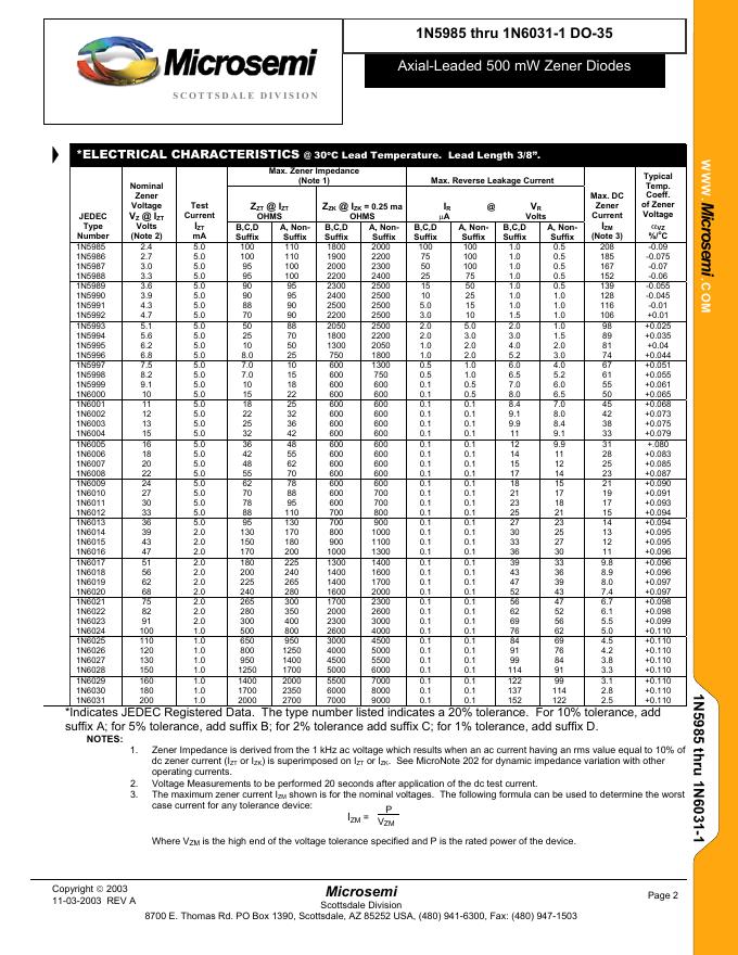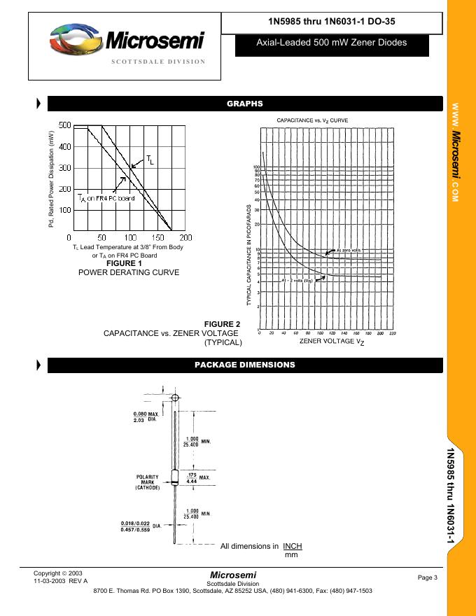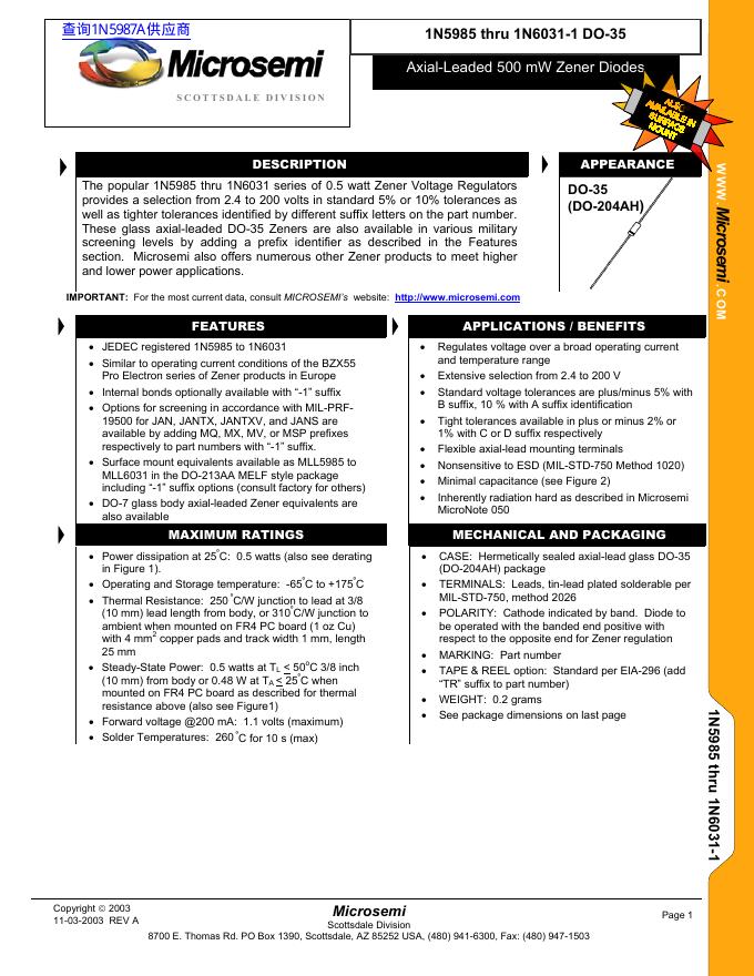 Microsemi Axial-Leaded 500 mW Zener Diodes 1N5985 thru 1N6031-1 DO-35 数据手册.pdf