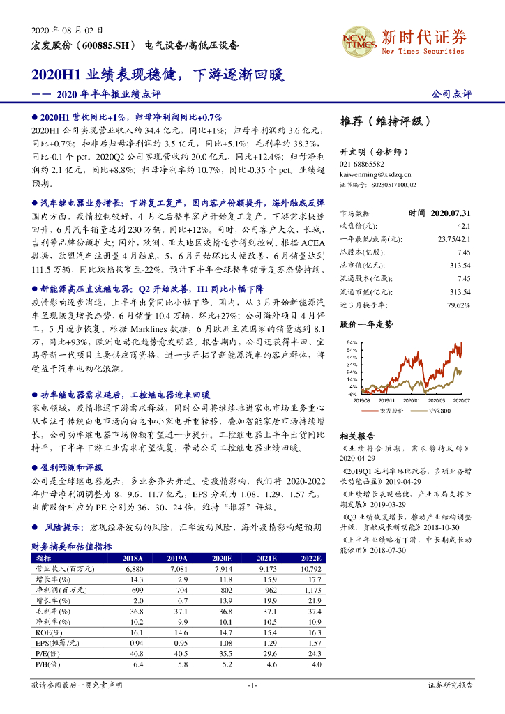 新时代证券:宏发股份(600885)-2020年半年报业绩点评:2020H1业绩表现稳健,下游逐渐回暖.pdf