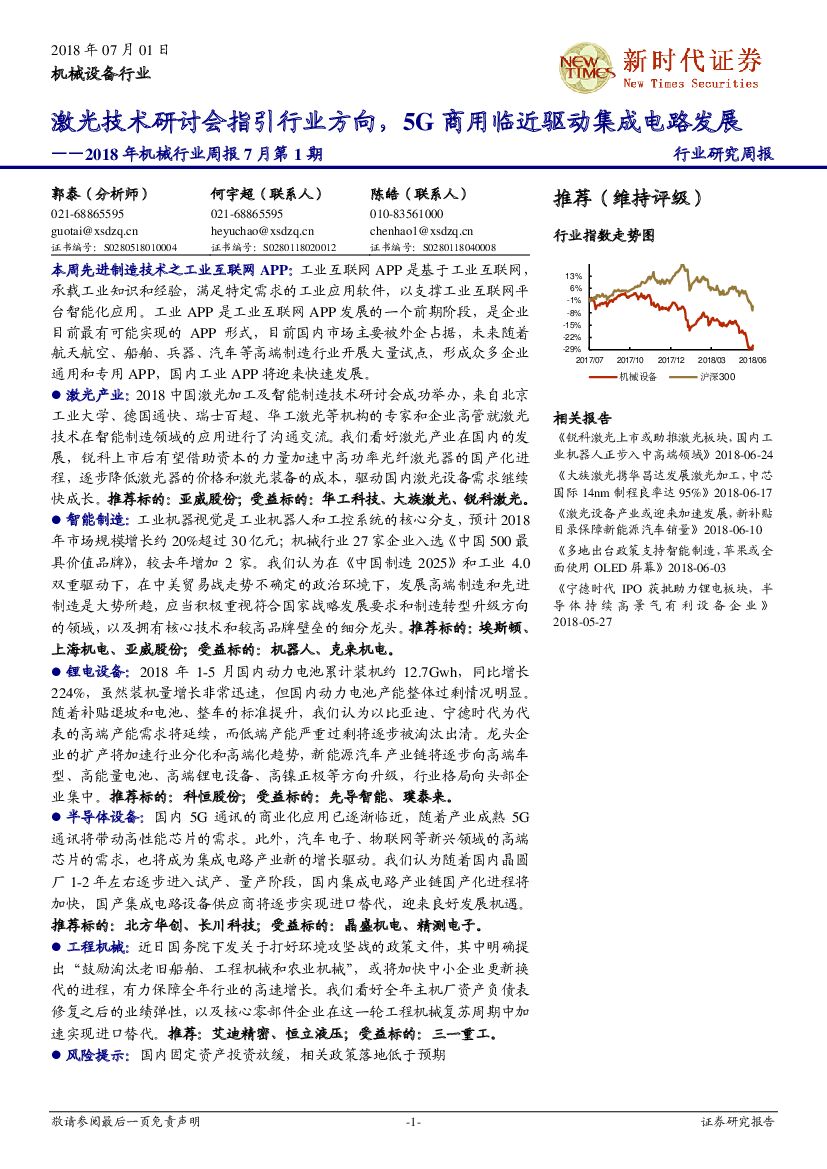 新时代证券:2018年机械行业周报7月第1期:激光技术研讨会指引行业方向,5G商用临近驱动集成电路发展.pdf