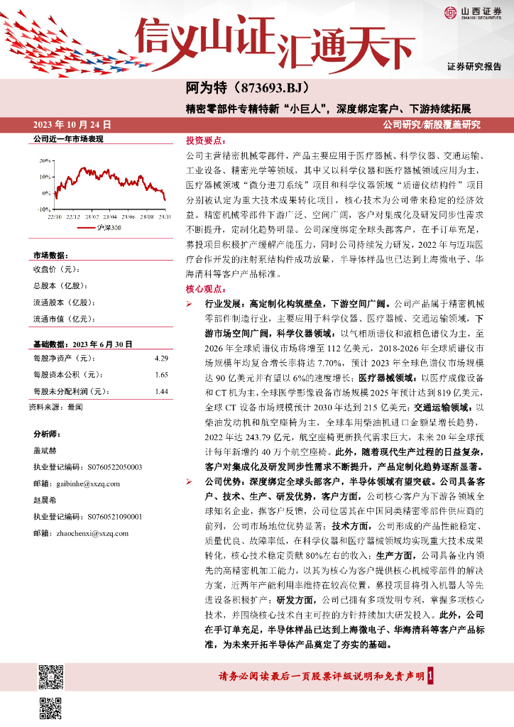 山西证券:阿为特(873693)-精密零部件专精特新“小巨人”, 深度绑定客户、下游持续拓展.pdf