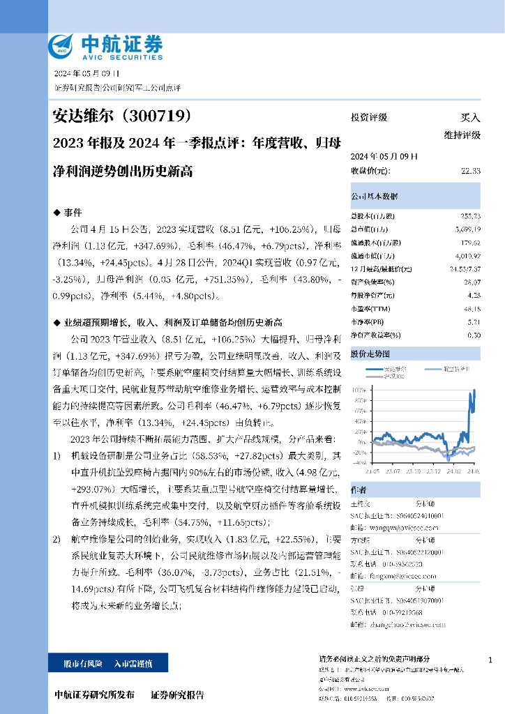 中航证券:安达维尔(300719)-2023年报及2024年一季报点评:年度营收、归母净利润逆势创出历史新高.pdf