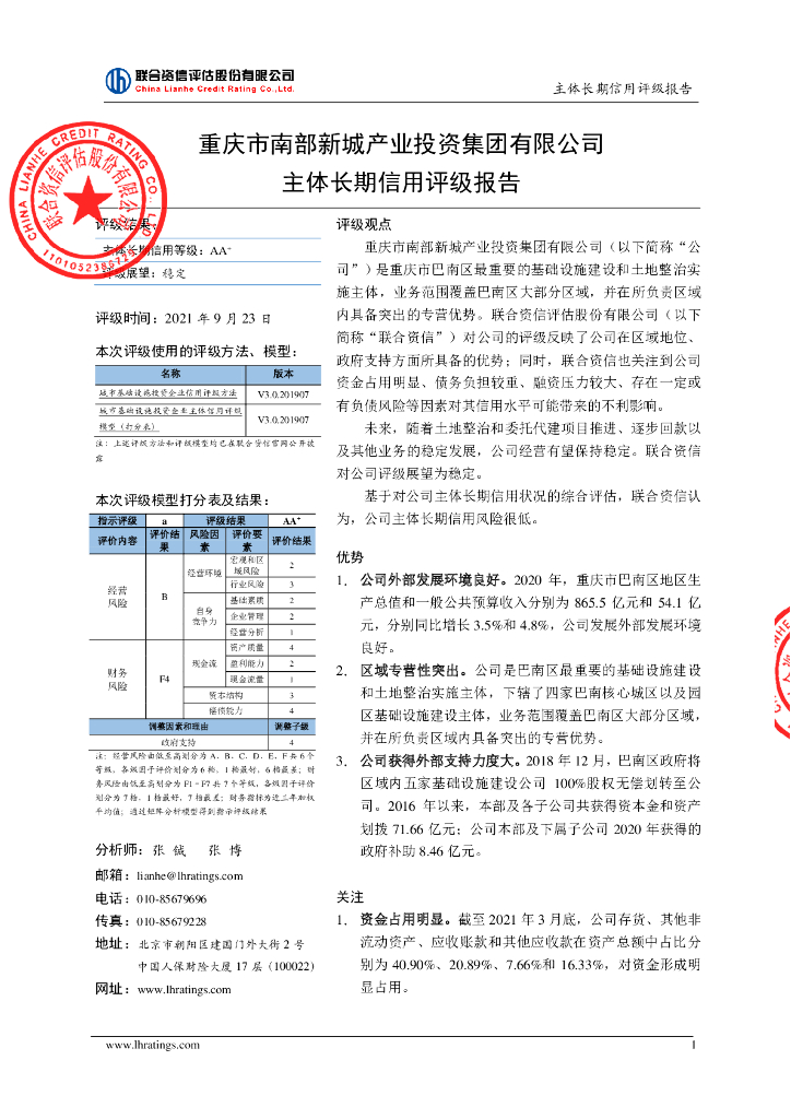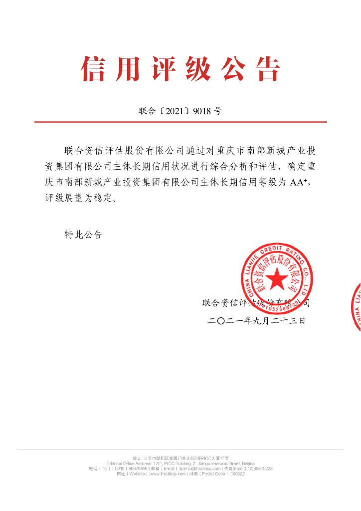 联合资信:重庆市南部新城产业投资集团有限公司主体信用评级报告.pdf
