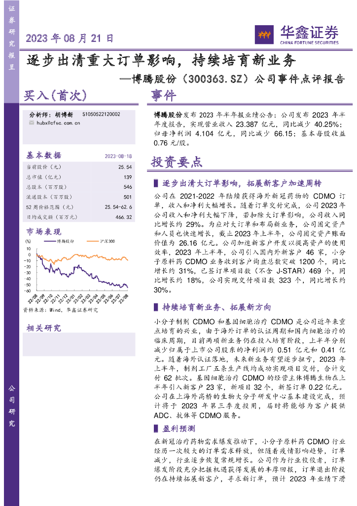 华鑫证券:博腾股份(300363)-公司事件点评报告:逐步出清重大订单影响,持续培育新业务.pdf
