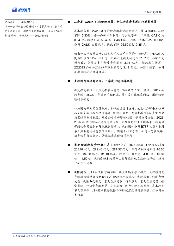 国海证券:吉祥航空(603885)-2023年半年报点评:2Q经营业绩环比改善,旺季弹性值得期待.pdf