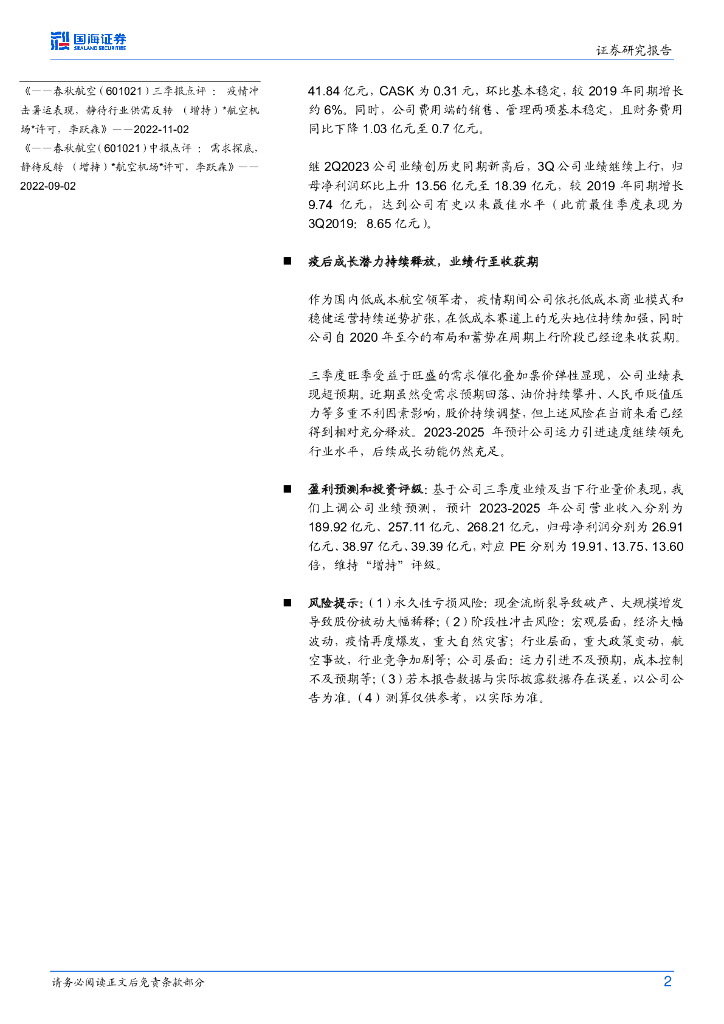 国海证券:春秋航空(601021)-2023年三季报点评:三季度归母净利润18.4亿元超预期,单季盈利继续向上突破.pdf