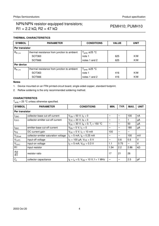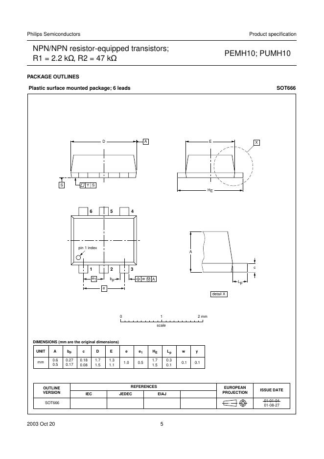 PHILIPS PEMH10; PUMH10 NPN/NPN resistor-equipped transistors; R1 = 2.2 kΩ, R2 = 47 kΩ 数据手册.pdf