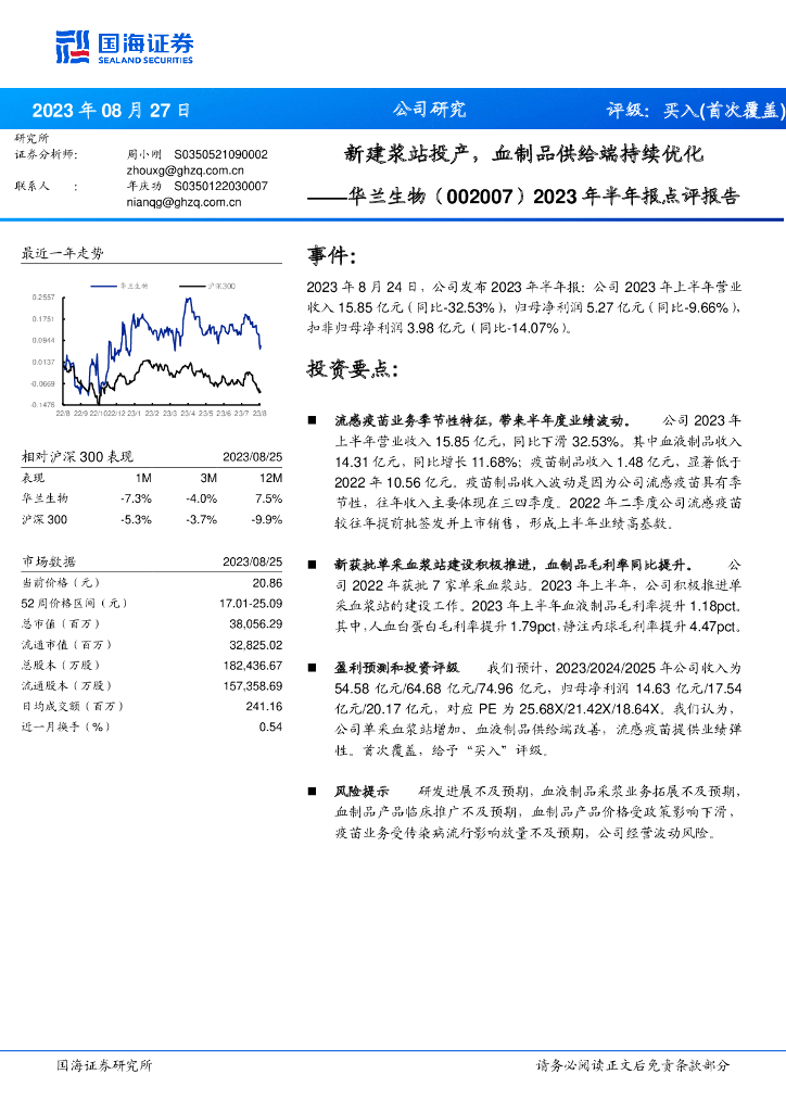 国海证券:华兰生物(002007)-2023年半年报点评报告:新建浆站投产,血制品供给端持续优化.pdf