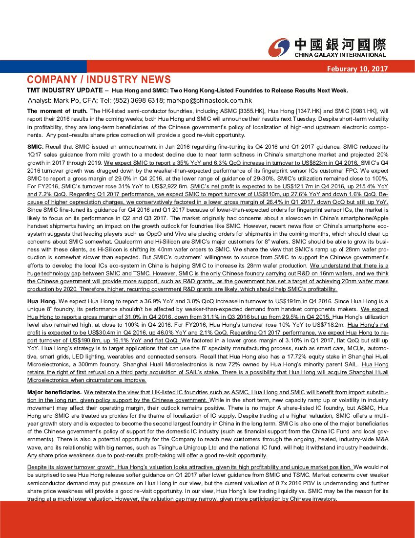 中国银河国际证券:TMT行业更新:华虹及中芯国际:两家半导体晶圆代工厂商下周公布业绩.pdf