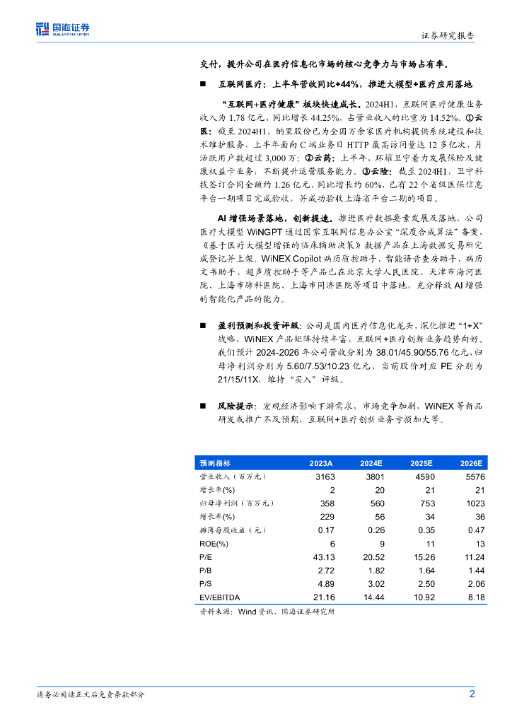 国海证券:卫宁健康(300253)-2024年半年报点评:互联网医疗营收同比+44%,盈利能力持续修复.pdf