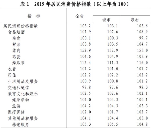 物价保持温和上涨。居民消费价格比上年上涨3.2%。其中,消费品价格上涨3.9%,服务项目价格上涨2.0%;食品价格上涨10.6%,非食品价格上涨1.5%。农业生产资料价格上涨7.6%,农产品生产者价格上涨12.2%。工业生产者出厂价格下降0.3%,购进价格下降0.8%。固定资产投资价格上涨2.8%。