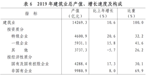 建筑业实力不断增强。具有资质等级的总承包和专业承包建筑业企业7714家,比上年增加481家。其中,特级和一级建筑企业983家,增加268家。建筑业总产值14269.3亿元,比上年增长10.6%。