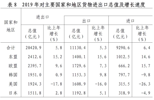 对外贸易稳旧拓新。货物进出口总额20420.9亿元,比上年增长5.8%。其中,出口11130.4亿元,增长5.3%;进口9290.6亿元,增长6.4%。出口商品中,机电产品出口4162.3亿元,增长4.5%;纺织服装出口1558.1亿元,增长2.4%;农产品出口1234.5亿元,增长7.3%。服务贸易进出口2379.4亿元,增长8.9%。其中,出口1182.6亿元,增长14.2%;进口1196.9亿元,增长4.1%。