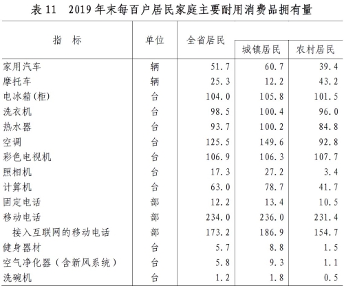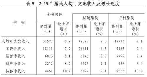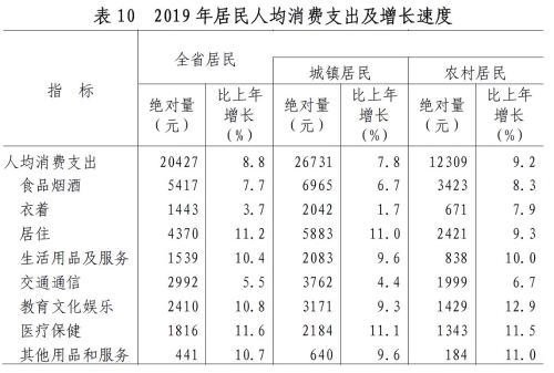 居民生活水平稳步提高。居民人均可支配收入31597元,比上年增长8.2%;人均消费支出20427元,增长8.8%。其中,城镇居民人均可支配收入42329元,增长7.0%;人均消费支出26731元,增长7.8%。农村居民人均可支配收入17775元,增长9.1%;人均消费支出12309元,增长9.2%。全省居民人均现住房建筑面积39.9平方米,其中城镇居民、农村居民分别为37.1平方米和43.5平方米。