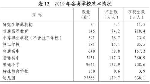 教育事业蒸蒸日上。新建改扩建幼儿园5537所,新增学位59.7万个。新补充中小学教师3.5万人、公办幼儿园教师1.0万人。基本消除66人以上超大班额。小学教育、初中教育、高中教育专任教师分别为44.3万人、29.3万人和14.3万人。中等职业学校专任教师4.8万人,普通高等学校专任教师11.8万人。实施中国特色高水平高职学校和专业(群)创建计划,15所高职院校入选。新设立山东第一医科大学、尼山世界儒学中心,筹建康复大学。ESI综合排名上榜高校达到21所,其中6所高校进入内地高校综合排名前100位。