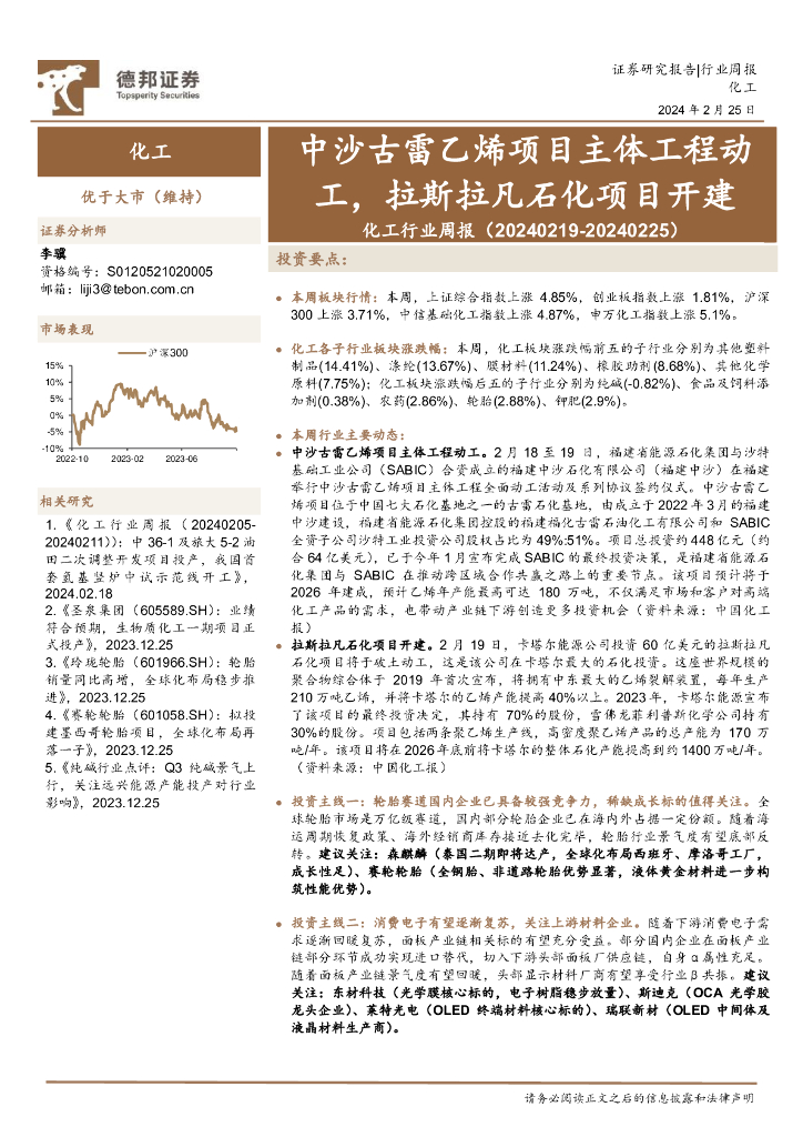 德邦证券:化工行业周报:中沙古雷乙烯项目主体工程动工,拉斯拉凡石化项目开建.pdf