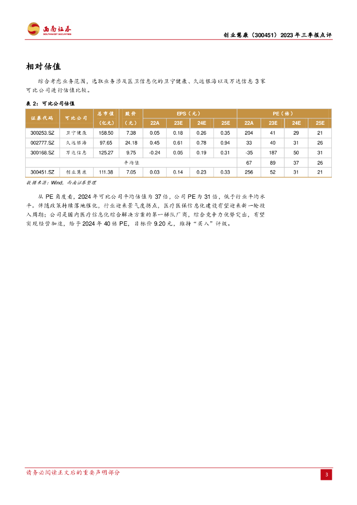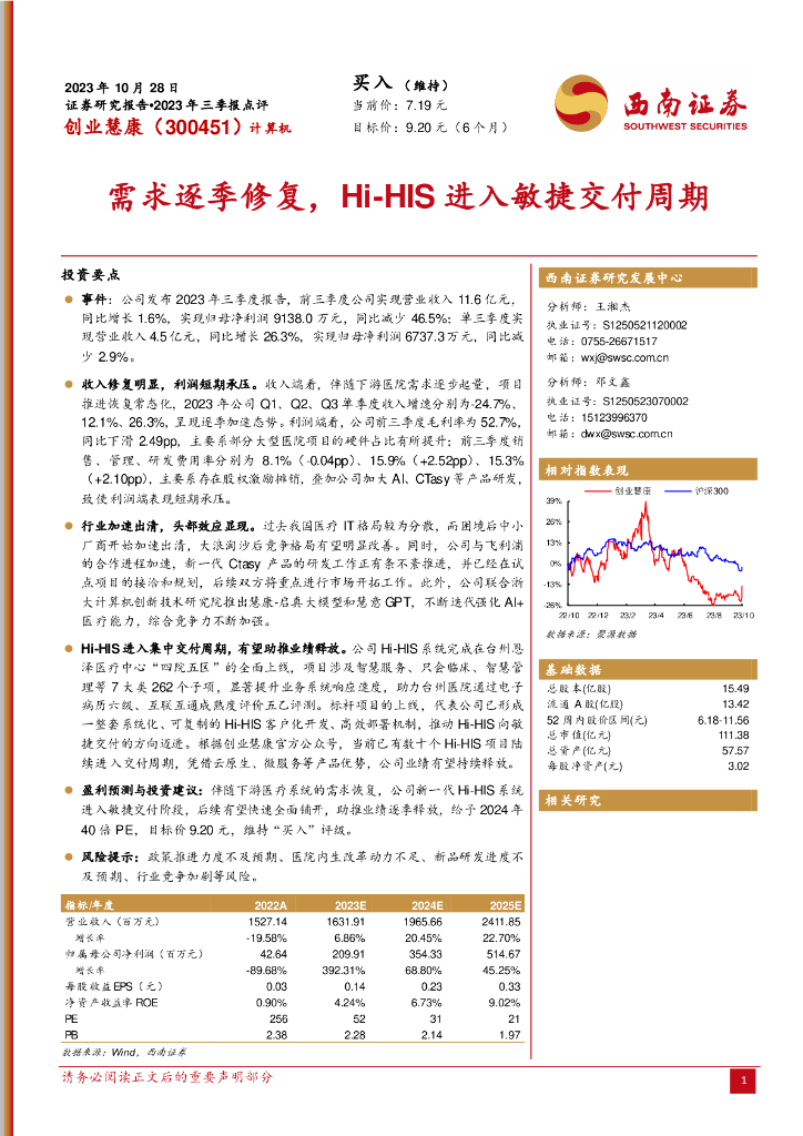 西南证券:创业慧康(300451)-2023年三季报点评:需求逐季修复,Hi-HIS进入敏捷交付周期.pdf