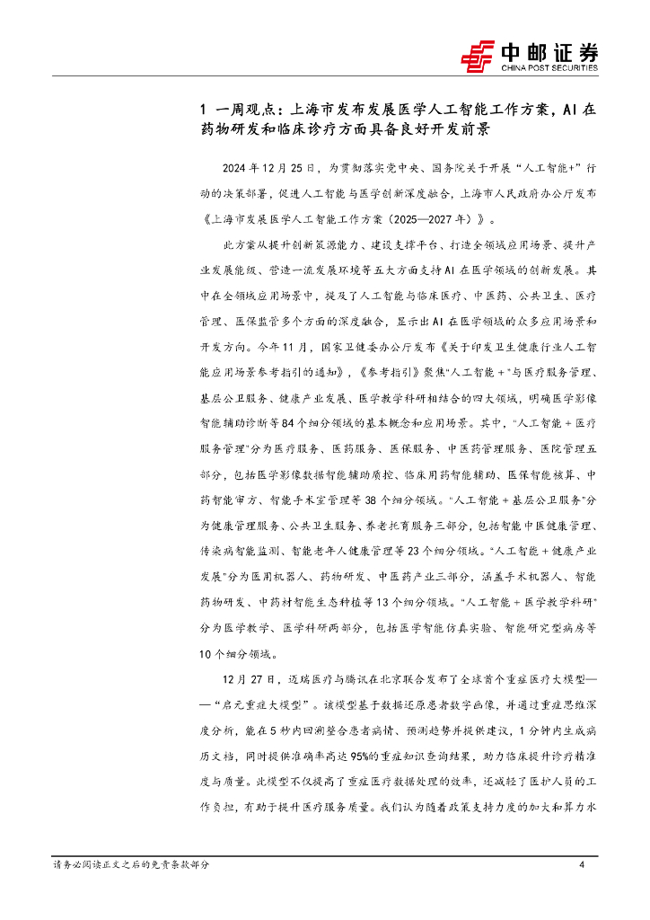 中邮证券:医药生物行业报告:上海发布发展医学人工智能工作方案,迈瑞与腾讯联合发布“启元重症大模型”.pdf
