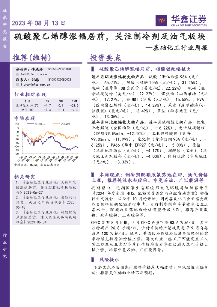 华鑫证券:基础化工行业周报:硫酸聚乙烯醇涨幅居前,关注制冷剂及油气板块.pdf