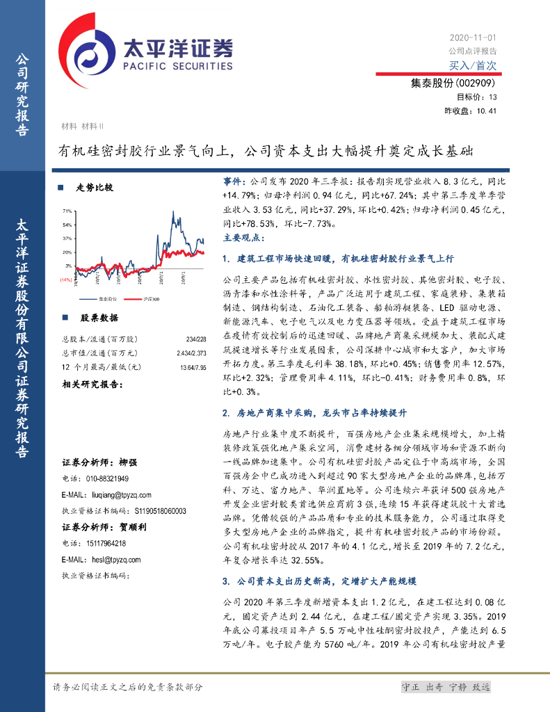 太平洋证券:集泰股份(002909)-有机硅密封胶行业景气向上,公司资本支出大幅提升奠定成长基础.pdf