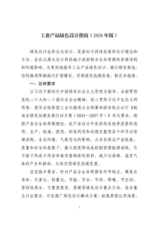 工业和信息化部办公厅:工业产品绿色设计指南(2026年版).pdf