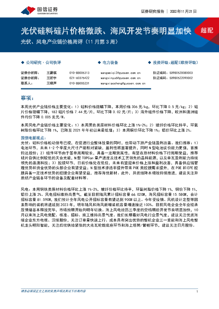 国信证券:光伏、风电产业链价格周评(11月第3周):光伏硅料硅片价格微跌、海风开发节奏明显加快.pdf