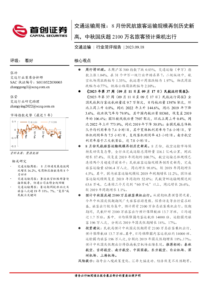 首创证券:交通运输周报:8月份民航旅客运输规模再创历史新高,中秋国庆超2100万名旅客预计乘机出行.pdf