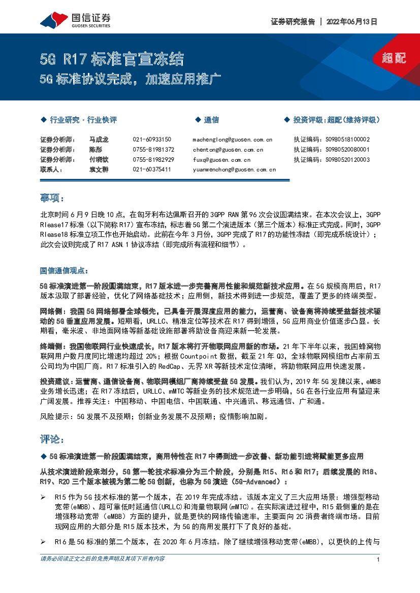 国信证券:通信:5G R17标准官宣冻结-5G标准协议完成,加速应用推广.pdf