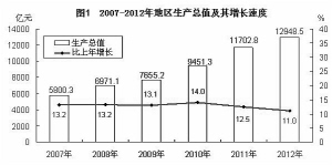 初步核算,全年实现地区生产总值12948.5亿元,比上年增长11.0%。其中,第一产业增加值1520.2亿元,增长4.6%;第二产业增加值6967.5亿元,增长13.1%;第三产业增加值4460.8亿元,增长9.5%。三次产业对经济增长的贡献率分别为5.0%、66.6%和28.4%。三次产业结构调整为11.7∶53.8∶34.5。人均生产总值28799元,增长10.5%。非公有制经济快速发展,实现增加值7246.1亿元,增长12.0%,占GDP的比重达56.0%。