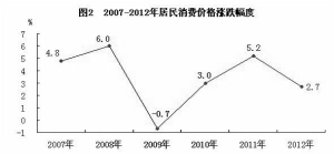 表1 2012年居民消费价格比上年涨跌幅度 单位:(%)