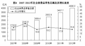 全年社会消费品零售总额4006.2亿元,比上年增长15.9%。分城乡看,城镇消费品零售额3331.2亿元,增长16.5%;乡村消费品零售额675.0亿元,增长12.8%。限额以上批发零售业零售额1307.8亿元,增长23.3%。其中,汽车类零售额308.9亿元,增长20.9%;家具类零售额27.6亿元,增长1.2倍;金银珠宝类零售额19.0亿元,增长25.4%;化妆品累零售额8.8亿元,增长21.5%;建筑及装潢材料类零售额17.0亿元,增长16.5%。