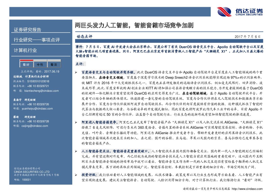 信达证券:计算机行业动态点评:两巨头发力人工智能,智能音箱市场竞争加剧.pdf