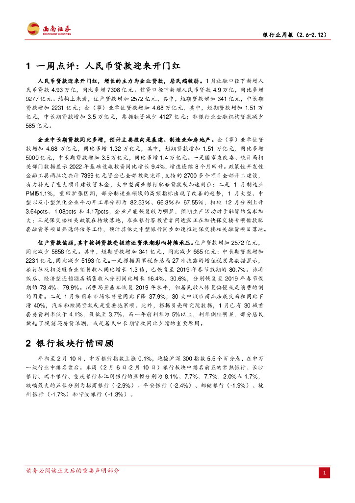 西南证券:银行业周报:人民币贷款“开门红”,信贷高增或延续.pdf