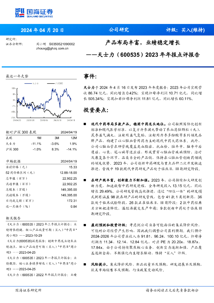 国海证券:天士力(600535)-2023年年报点评报告:产品布局丰富,业绩稳定增长.pdf