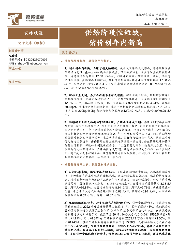 德邦证券:农林牧渔行业周报:供给阶段性短缺,猪价创年内新高.pdf