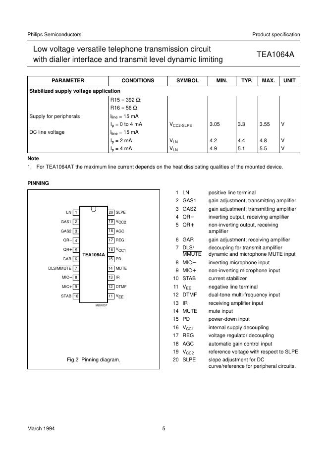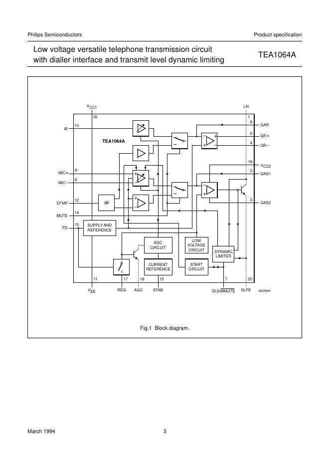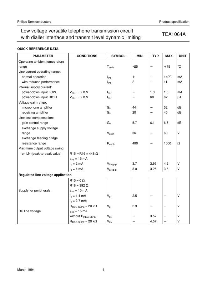 PHILIPS TEA1064A Low voltage versatile telephone transmission circuit with dialler interface and transmit level dynamic limiting 数据手册.pdf