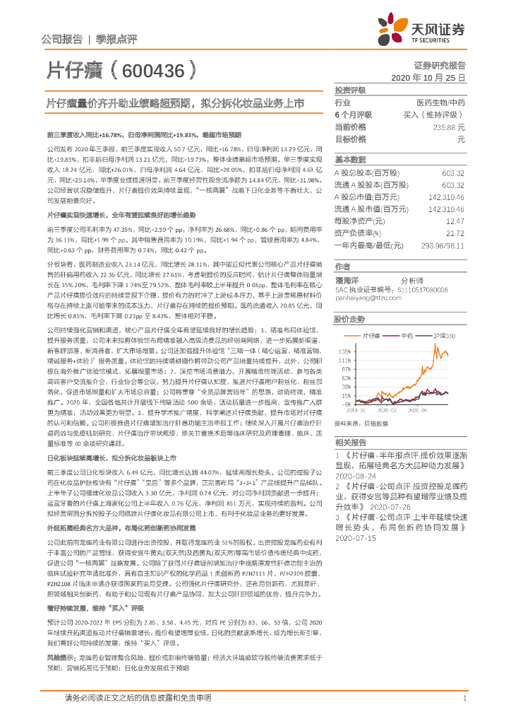 天风证券:片仔癀量价齐升助业绩略超预期,拟分拆化妆品业务上市.pdf
