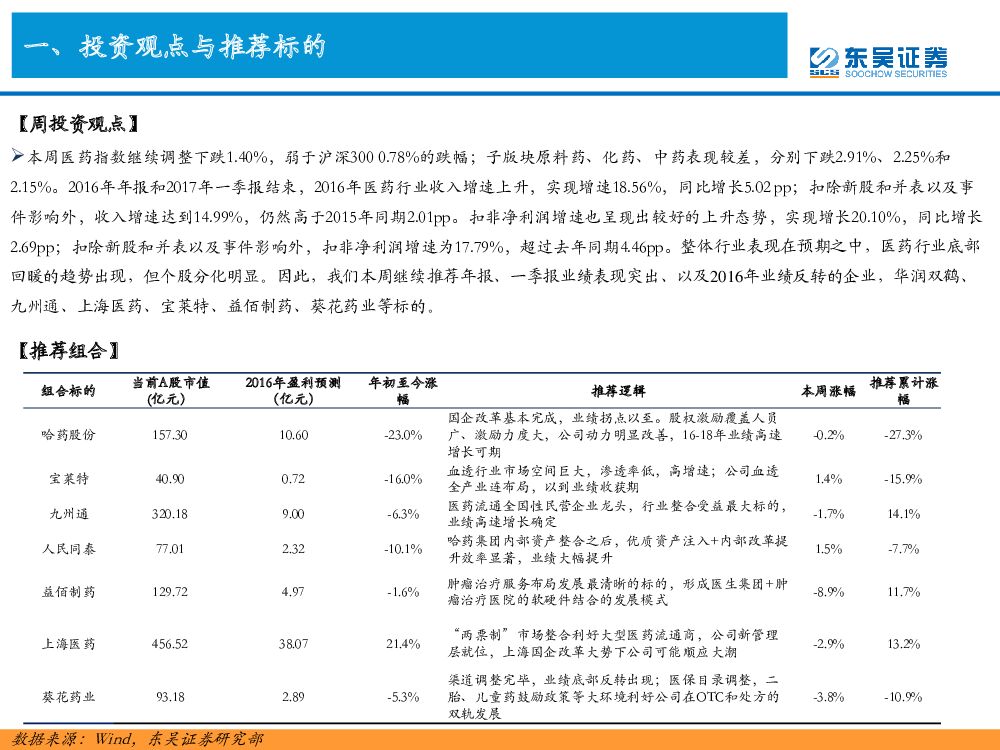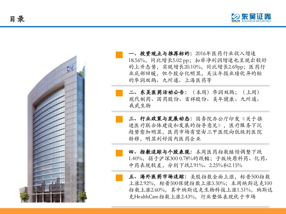 东吴证券:东吴医药行业周观点:2016年医药行业回暖:收入增速18.56%,同比增长5.02pp;扣非净利润增长20.10%,同比增长2.69pp.pdf