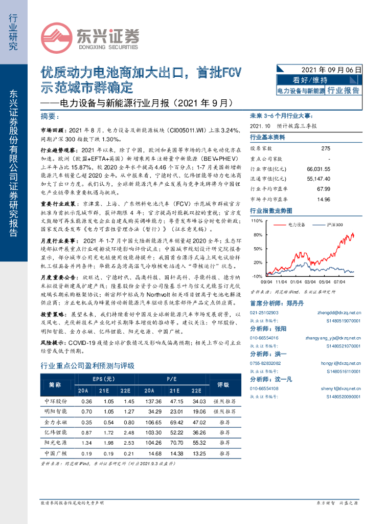 东兴证券:电力设备与新能源行业月报(2021年9月):优质动力电池商加大出口,首批FCV示范城市群确定.pdf