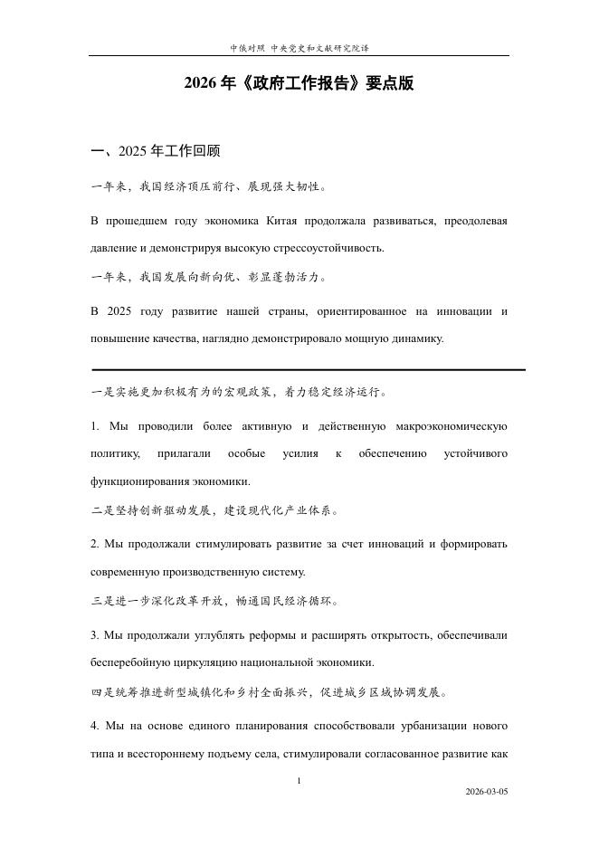 中央党史和文献研究院:2026年《政府工作报告》要点版(中俄对照).pdf