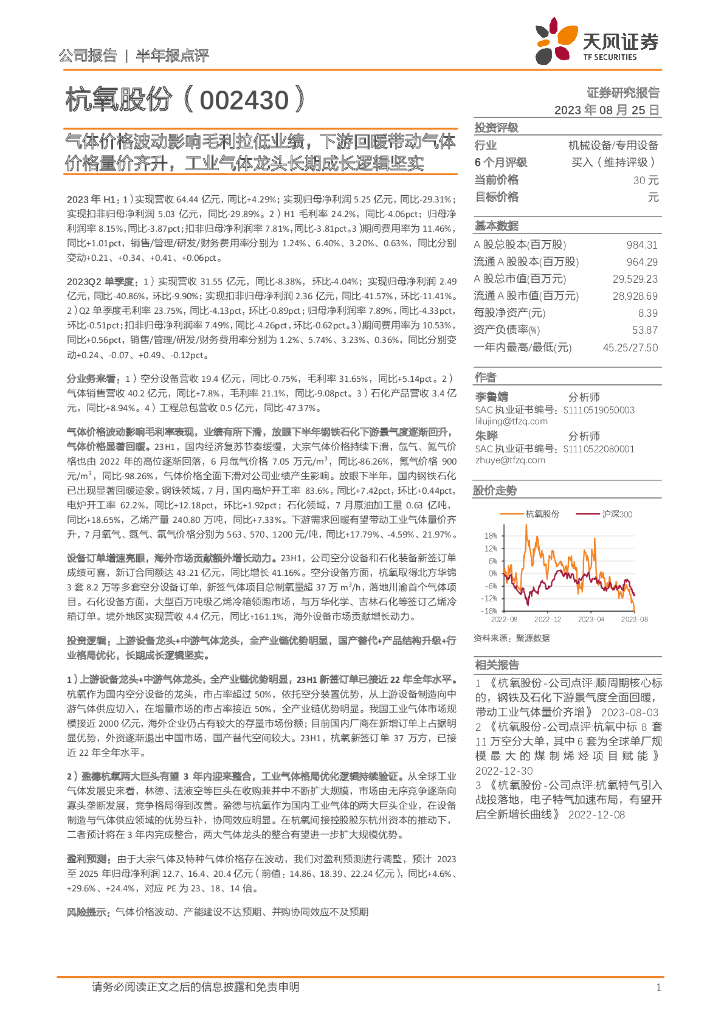 天风证券:杭氧股份(002430)-气体价格波动影响毛利拉低业绩,下游回暖带动气体价格量价齐升,工业气体龙头长期成长逻辑坚实.pdf